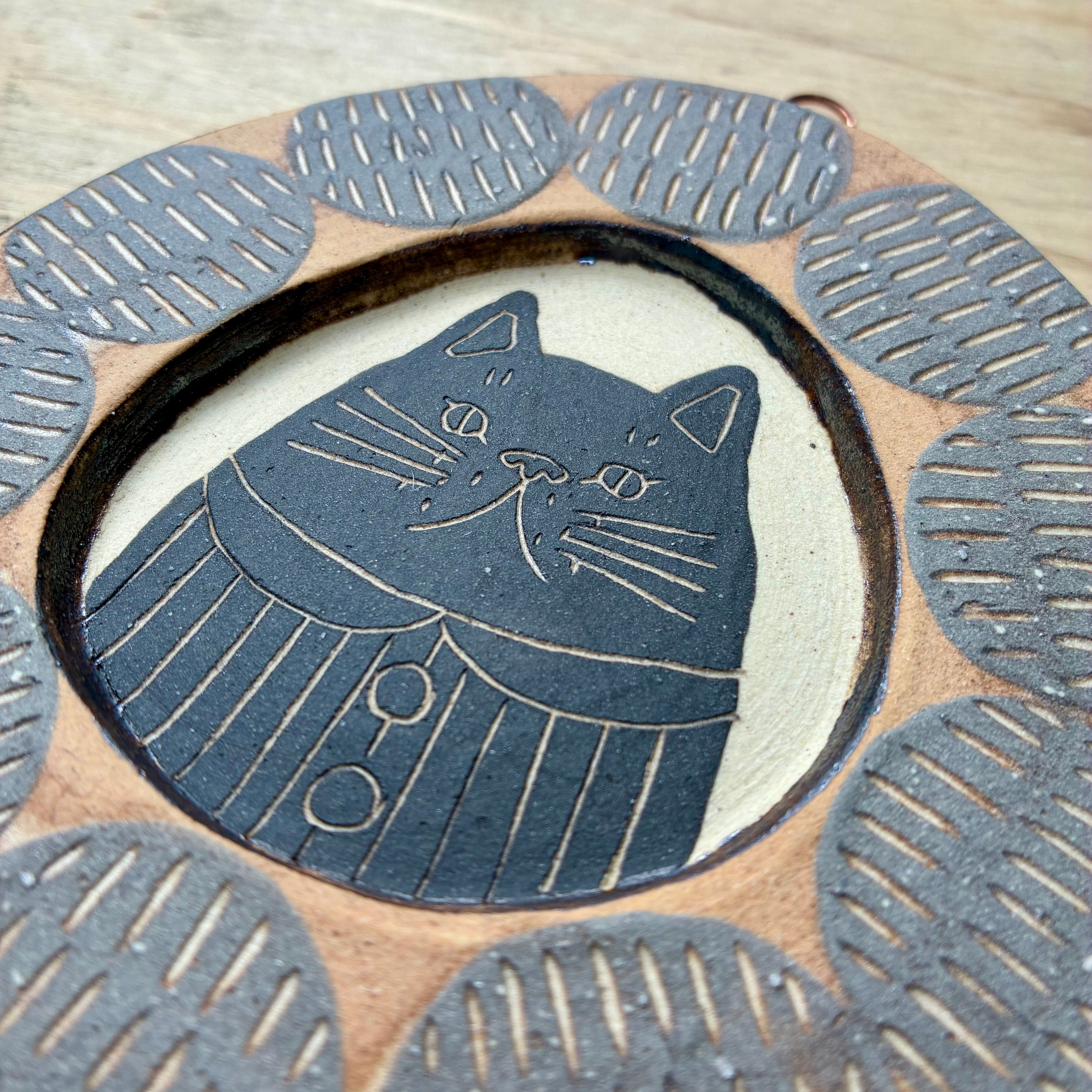 A ceramic plaque resembling a cat's portrait.