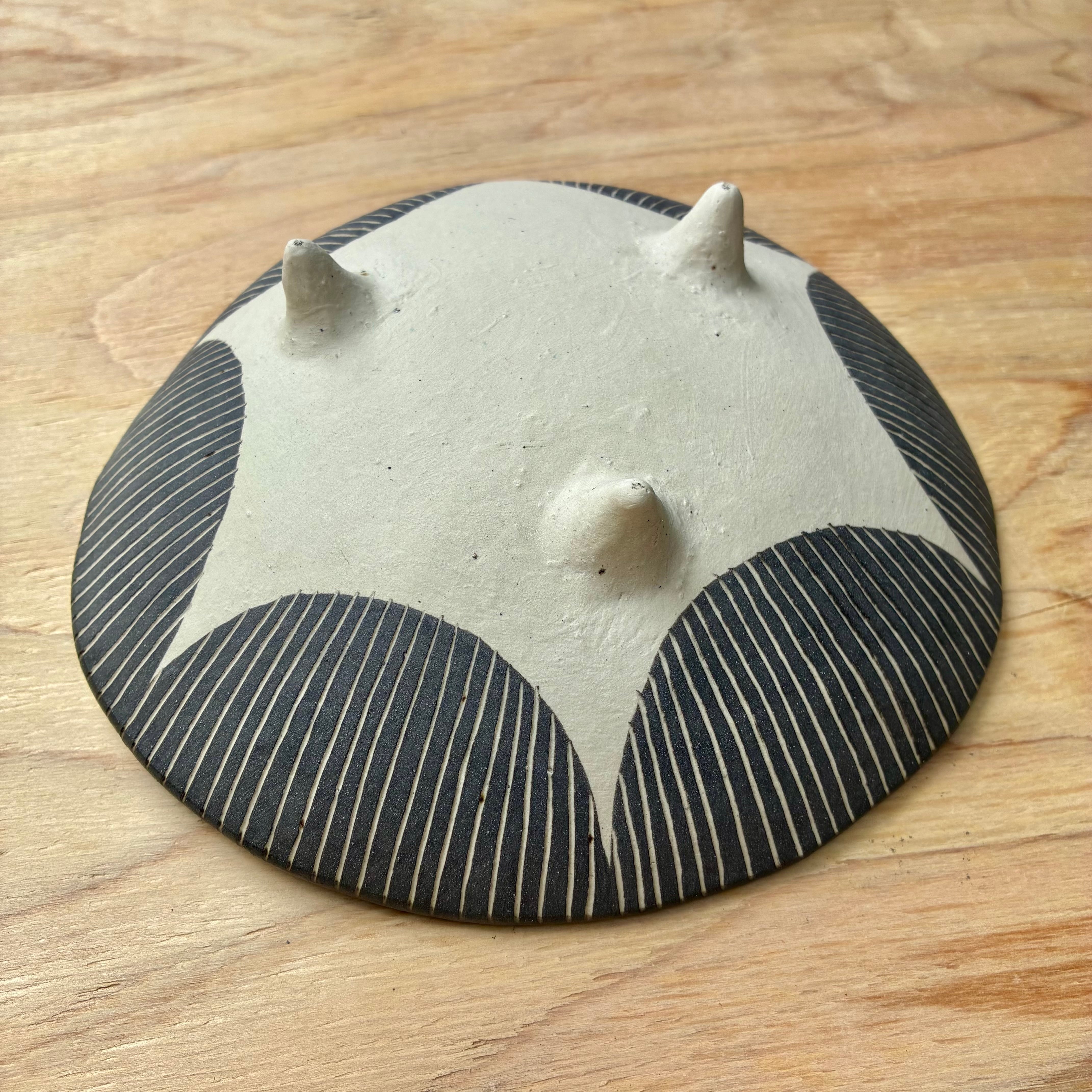 三本のツノのような脚が付いたお皿。